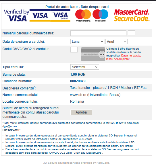 Scrieti informatiile de pe card si de pe spatele cardului, alegeti tipul cardului, apoi apasati pe butonul Aproba.