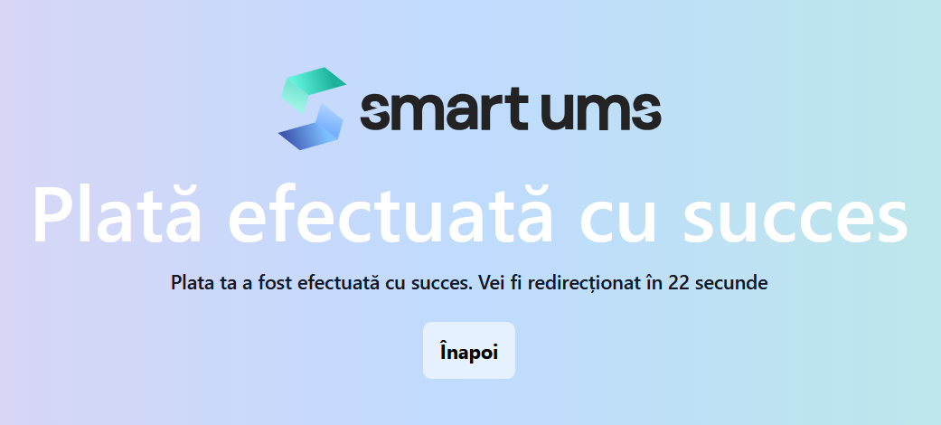 !!!ATENTIE!!! Dupa acest pas sunteti redirectionat catre verificarea 3dSecure/etc cu banca dumneavoastra. Validati plata si nu reimprospatati pagina, asteptati sa fie validata cu succes apoi reveniti la pagina initiala pe smartums.ub.ro