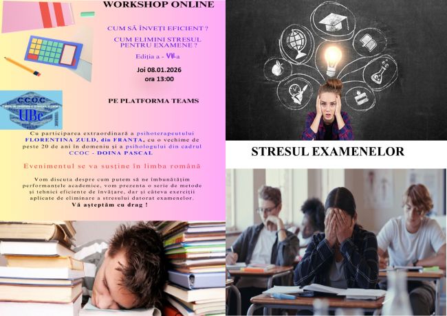 În data de 08.01.2026, sub coordonarea dnei psiholog Doina PASCAL, Centrul de Consiliere și Orientare în Carieră a realizat workshop-ul „Cum să înveți eficient? Cum elimini stresul pentru examen?” ediția a VII-a, pe platforma online Teams. Invitata evenimentului a fost dna Florentina ZULD din Franța, psihoterapeut și specialist în psihoterapia traumelor, cu activitate în domeniu de peste douăzeci de ani, alături de coordonatoarea centrului, prof.univ.dr. Venera-Mihaela COJOCARIU.