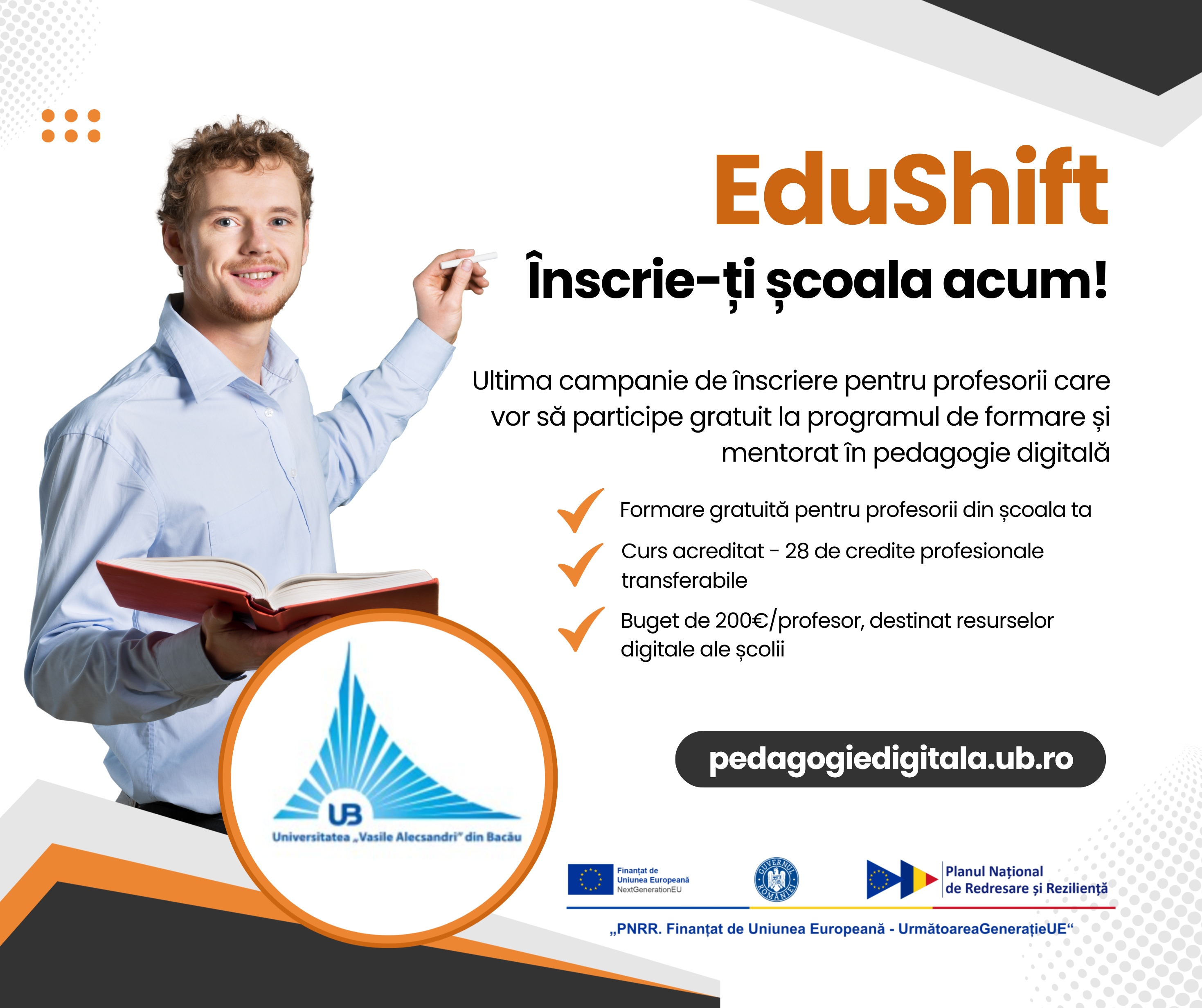 Proiectul PNRR EduShift: Pedagogie digitală pentru cadrele didactice din învățământul preuniversitar anunță lansarea ultimei campanii naționale de înscriere a școlilor, pentru a oferi profesorilor oportunitatea de a participa gratuit la cel mai amplu program de formare și mentorat în competențe digitale și pedagogie digitală derulat în România.