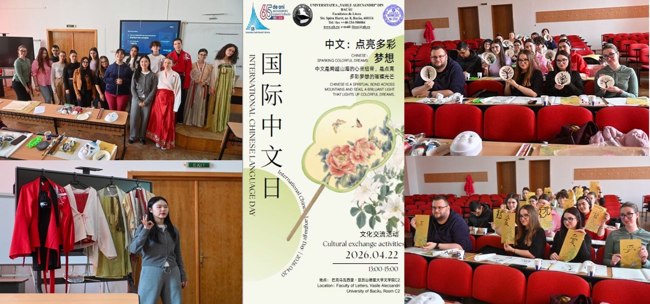 Facultatea de Litere a Universității „Vasile Alecsandri” din Bacău a organizat miercuri, 22 aprilie 2026, în Amfiteatrul „Dumitru Alistar”, un atelier cultural interactiv dedicat Zilei internaționale a limbii chineze. Acest eveniment extracurricular a adus în atenția participanților frumusețea limbii și culturii chineze prin artă, simboluri și experiențe creative.