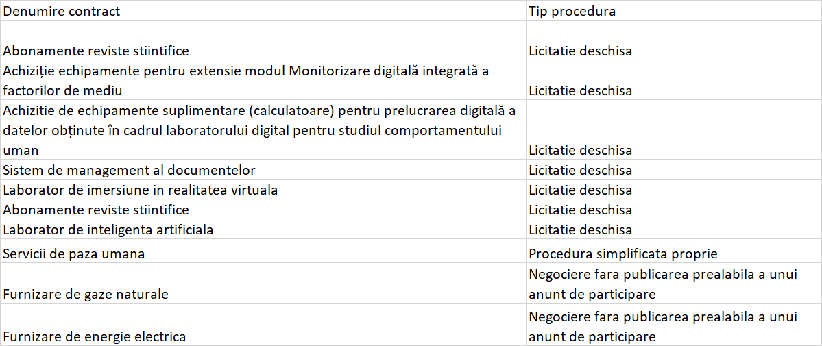 Pentru orice detalii cu privire la achizitiile pe care le realizam va rugam sa consultati www.e-licitatie.ro . Conform procedurii interne si a politicii de calitate, institutia noastra colaboreaza cu furnizori care au fost inclusi in lista furnizorilor agreati la nivel de institutie. Pentru orice alte informatii cu privire la achizitiile publice aferente institutiei noastre va stam la dispozitie la nr de tel 0234/542411 interior 195.