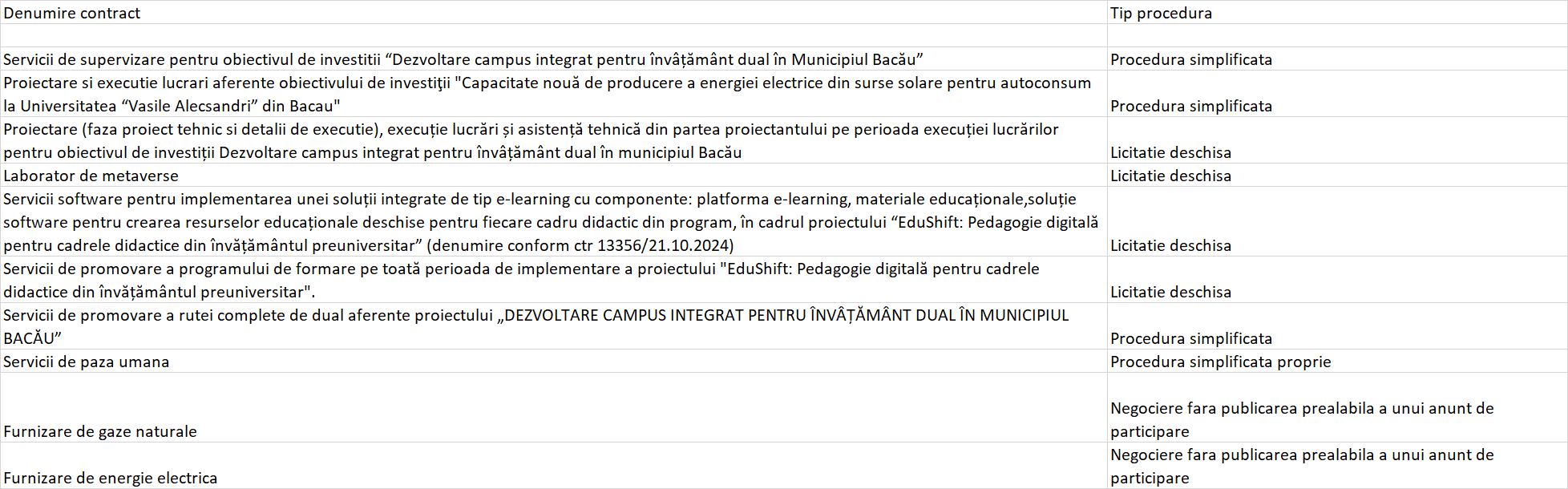 Pentru orice detalii cu privire la achizitiile pe care le realizam va rugam sa consultati www.e-licitatie.ro . Conform procedurii interne si a politicii de calitate, institutia noastra colaboreaza cu furnizori care au fost inclusi in lista furnizorilor agreati la nivel de institutie. Pentru orice alte informatii cu privire la achizitiile publice aferente institutiei noastre va stam la dispozitie la nr de tel 0234/542411 interior 195.