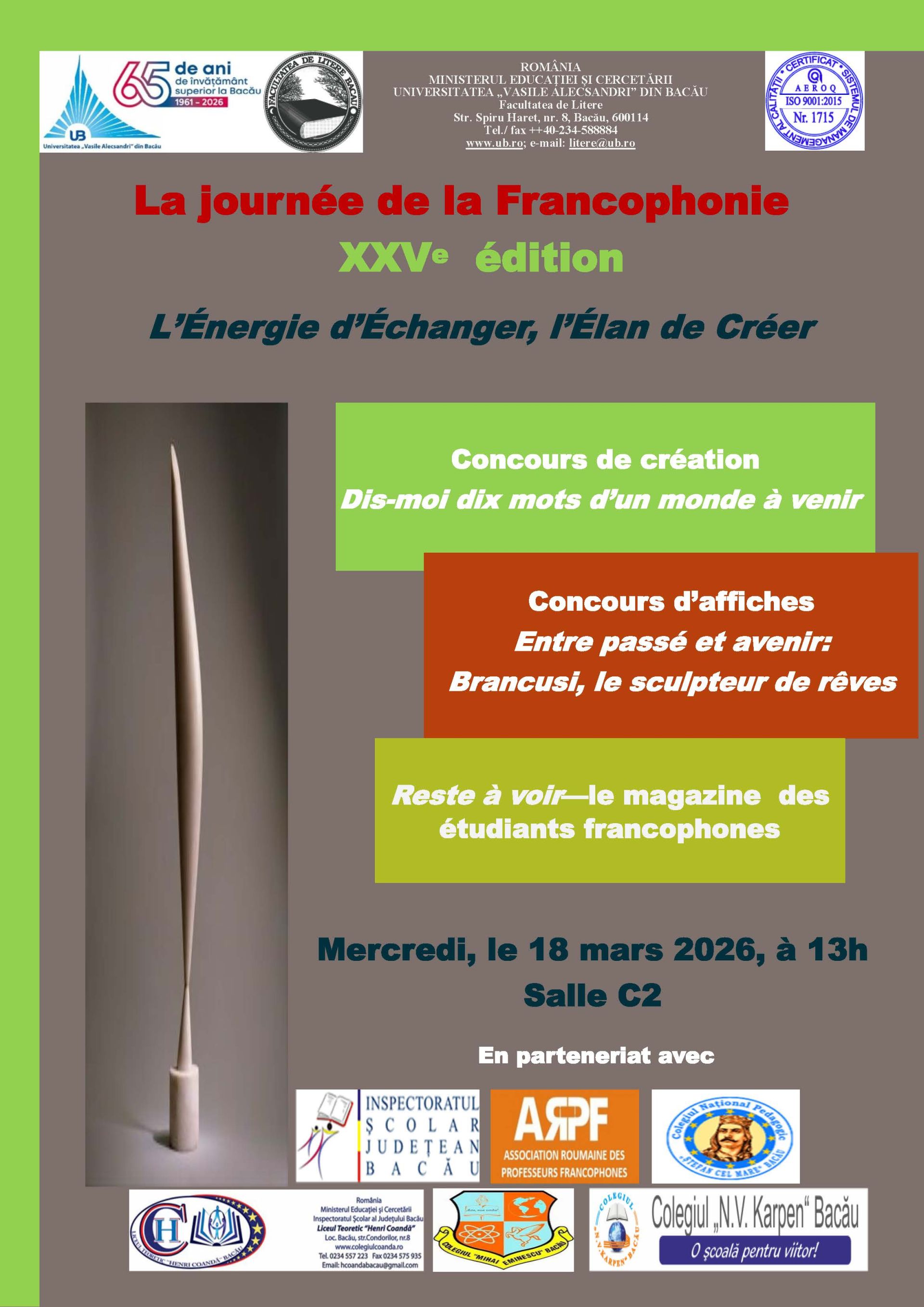 Concursul „Dis-moi dix mots d’un monde à venir” a provocat deja imaginația tinerilor ale căror creații (literare, artistice, scurte materiale video, benzi desenate) vor fi prezentate și premiate. Speciale și originale se anunță și afișele, posterele, interviurile imaginare care celebrează personalitatea lui Constantin Brâncuși, la 150 de ani de la naștere. Va fi, totodată, prezentat noul număr al revistei „Reste à voir”, publicație redactată și realizată de studenții francofoni băcăuani, îndrumați de profesorii lor.